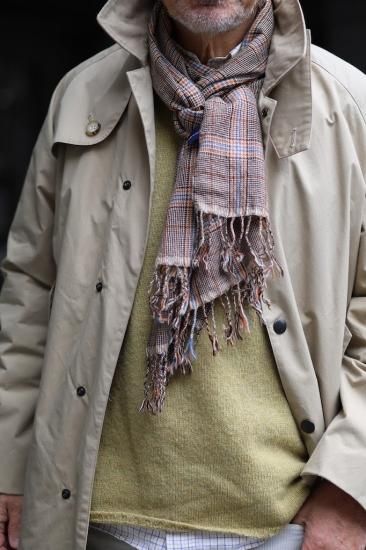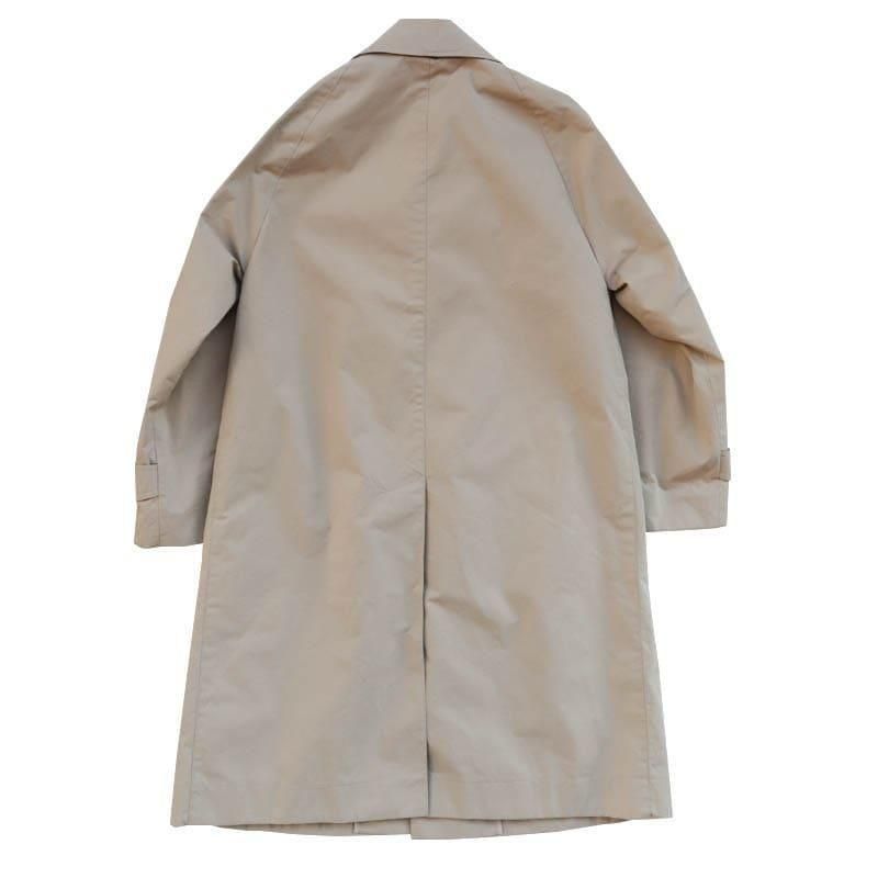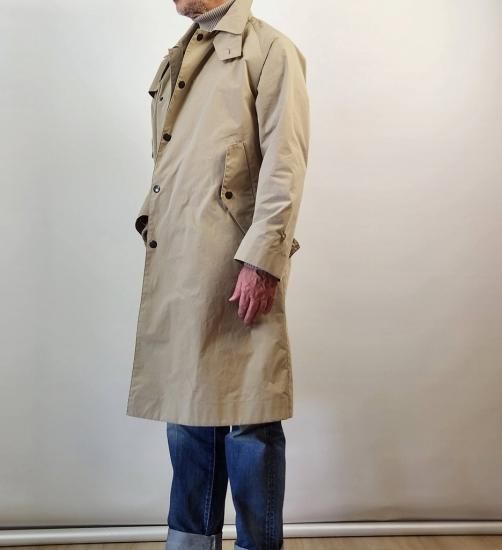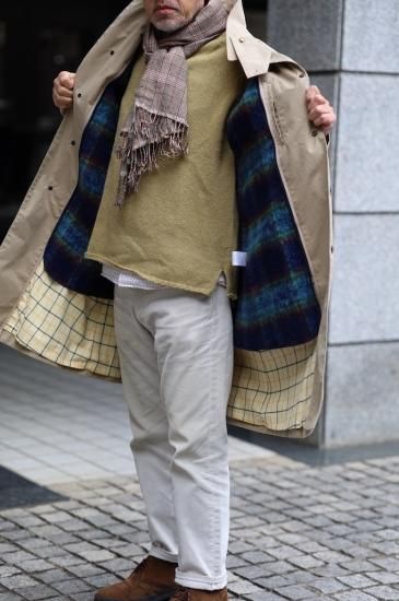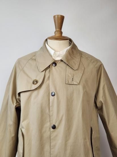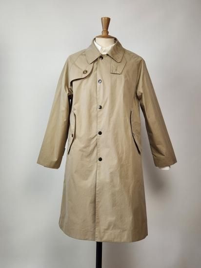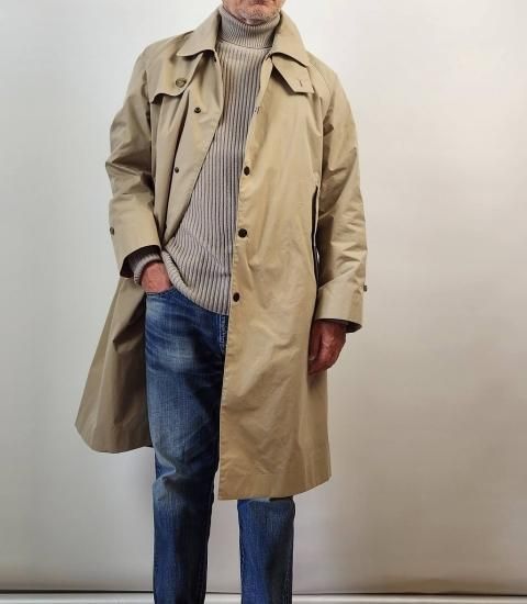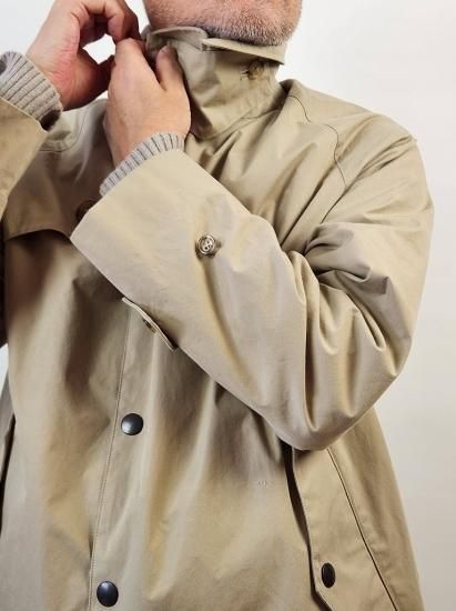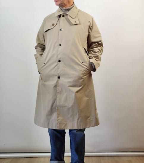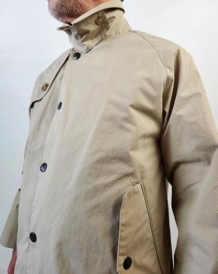 金属のツヤ消しブラックのドット釦が特徴的で、シャギータータンのライナーが付いたスリーシーズンコートは、快適性とスタイリッシュさを両立。