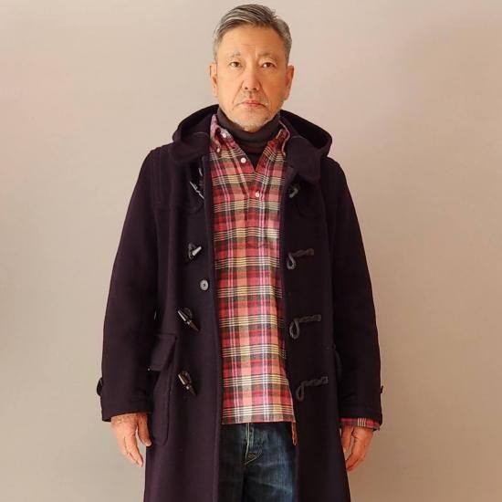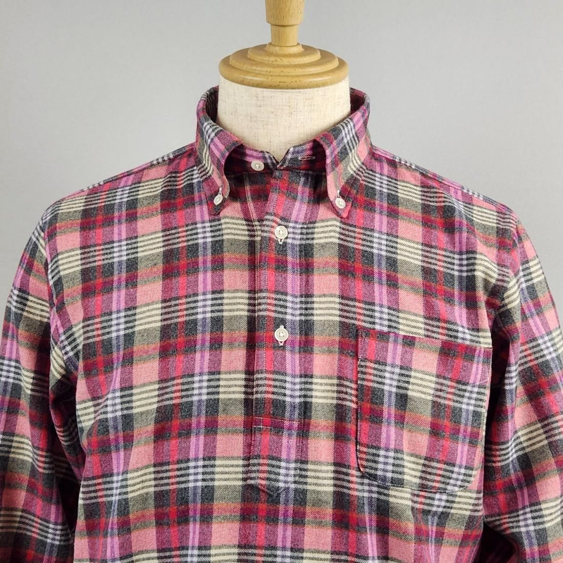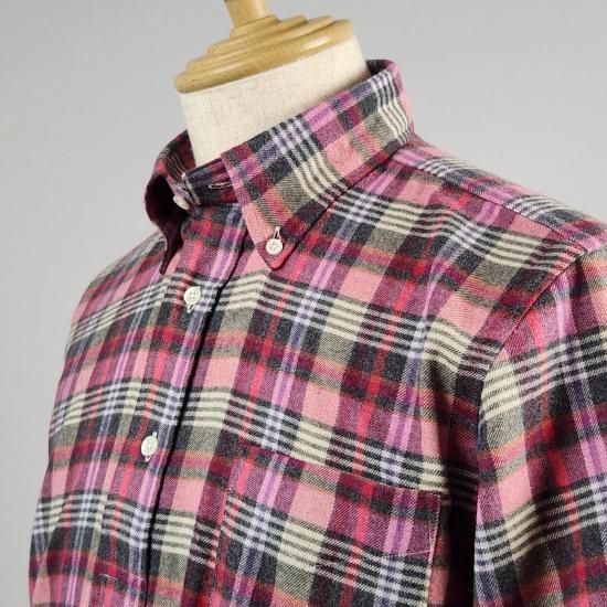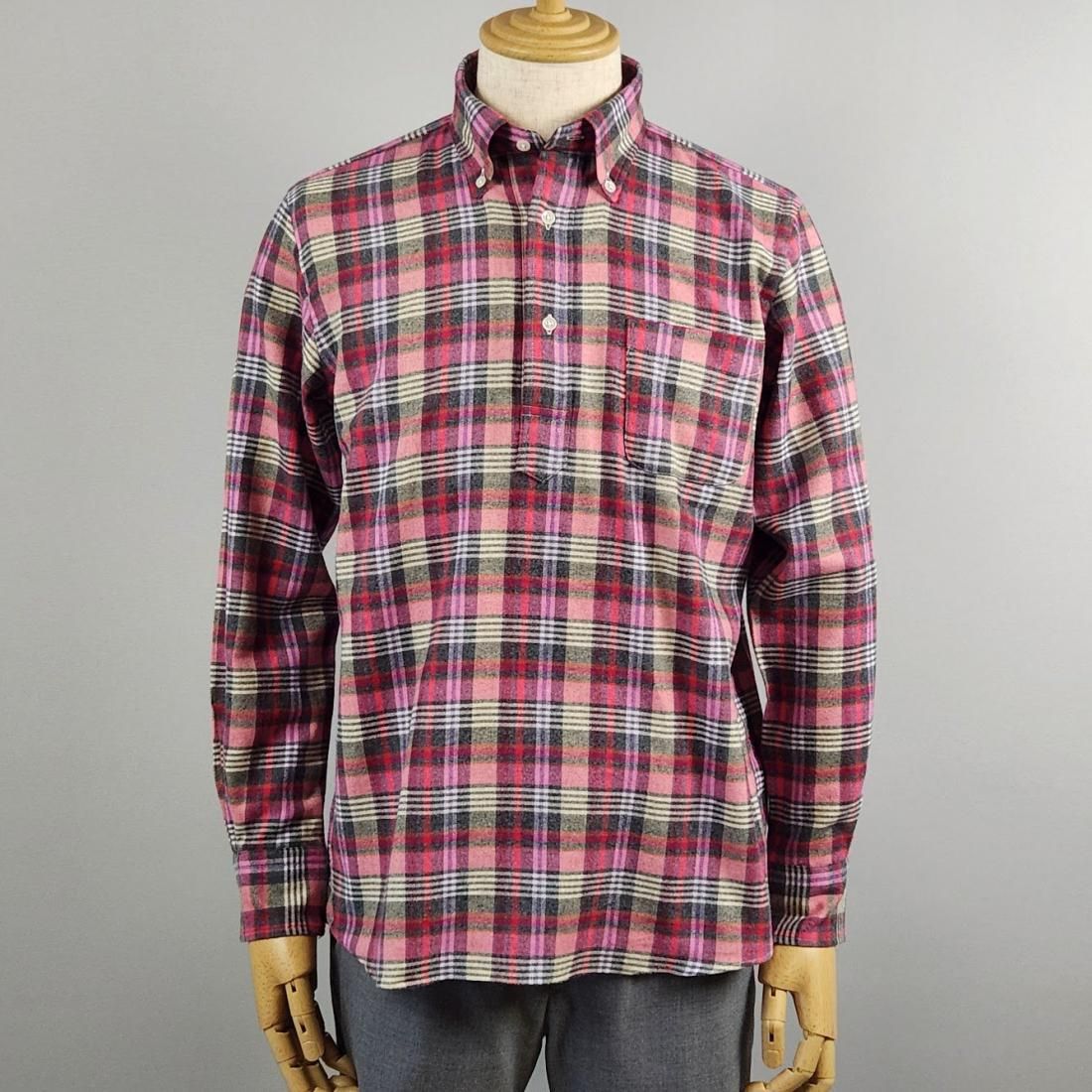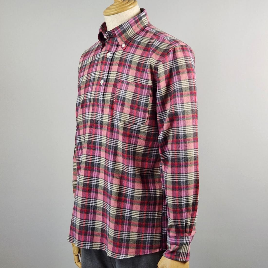 プルオーバーのボタンダウンは、SOUTIENCOL創業以来のマスターピース。幾度もマイナーチェンジして代表作となりました。生地はイタリアCancliniのネルチェック。色の使い方など日本の生地にはない斬新なデザイン。