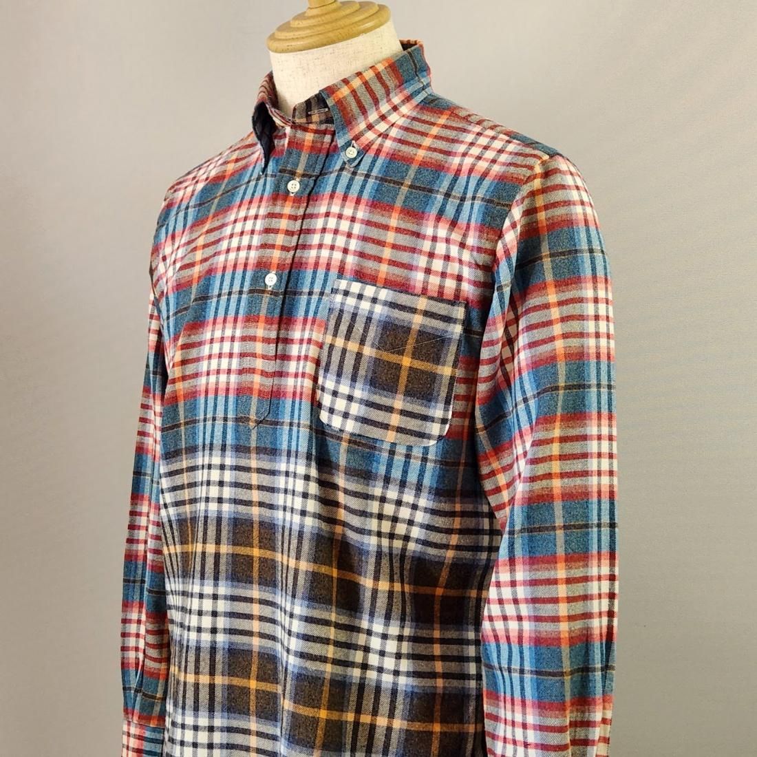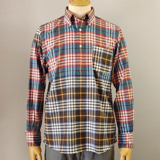 プルオーバーのボタンダウンは、SOUTIENCOL創業以来のマスターピース。幾度もマイナーチェンジして代表作となりました。生地はイタリアCancliniのネルチェック。色の使い方など日本の生地にはない斬新なデザイン。